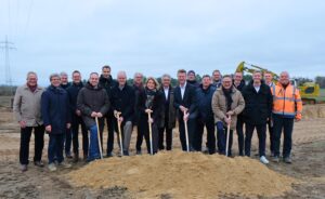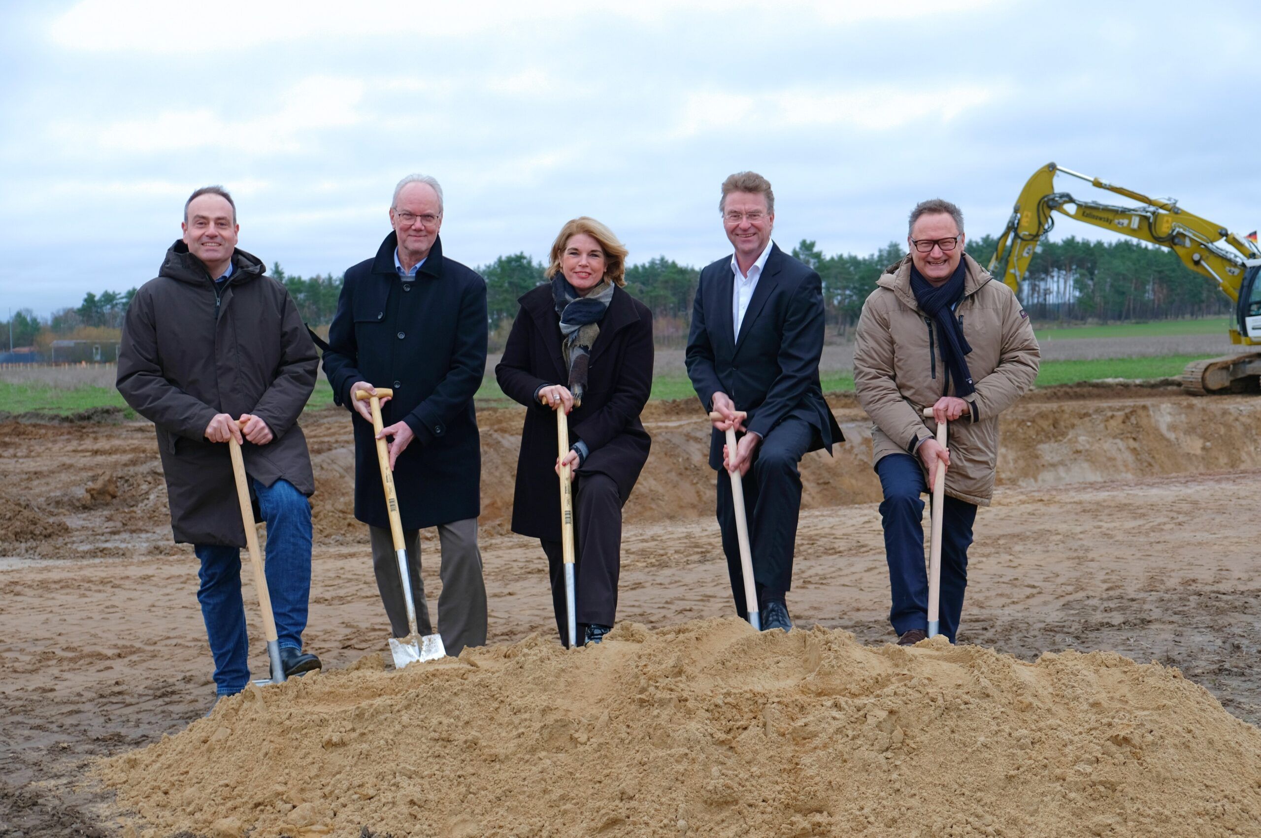 Sie setzten den ersten Spatenstich (v.l.n.r.): Ulrich Stock, Vorstandssprecher der Volksbank Lüneburger Heide eG, Manfred Cohrs, Aufsichtsratsvorsitzender der WLH Wirtschaftsförderung im Landkreis Harburg GmbH, Lüneburgs Oberbürgermeisterin Claudia Kalisch, WLH-Geschäftsführer Jens Wrede sowie Michael Kiesewetter, Vorstandsvorsitzender der NBank. Mit dabei: Weitere Projektpartner und -unterstützer.